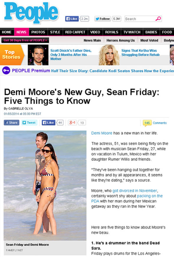 Demi Moore, absolutamente em forma aos 51 anos, parece que já esqueceu de vez Ashton Kutcher, de quem se separou há dois anos e divorciou oficialmente em outubro. E continua gostando de namorados mais jovens. A edição online da revista People publicou foto dela na praia de Tulum, no México, com aquele de deve ser seu novo namorado. É Sean Friday, baterista da banda Dead Sara. Cheio de tatuagens, o rapaz tem apenas 27 anos . Ou seja, 24 anos mais jovem que a bela.