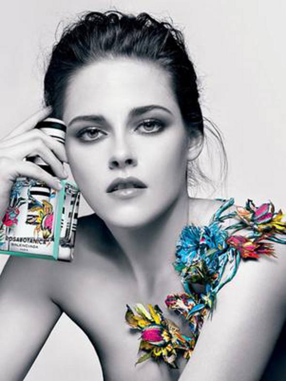 A atriz Kristen Stewart será o carro-chefe da campanha publicitária do perfume Rosabotanica, da Balenciaga. Ela postou no Instagram, foto do trabalho, em que ela aparece de topless. Na imagem, os seios aparecem cobertos por flores coloridas, contratando com o resto da imagem, em preto e branco, exceto a embalagem da fragrância. É a terceira vez que ela posa para a Balenciaga.