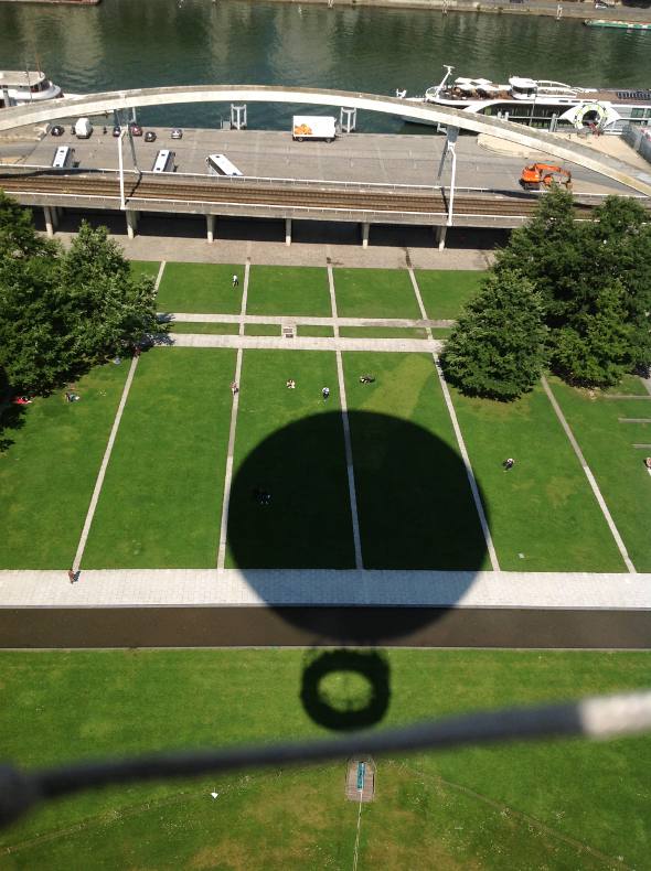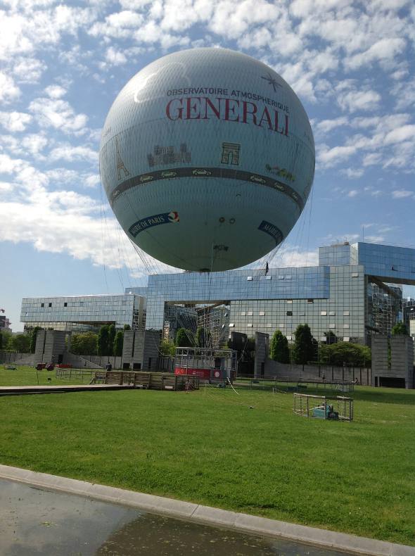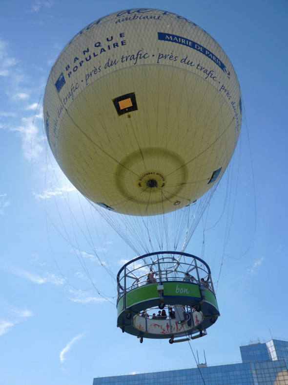 Já tinha feito a experiência em Berlim e repeti em Paris. Dar um passeio de balão. Não é bem um passeio de balão, mas é quase isso. O balão francês fica no gramado central do Parque André Citroën, pertinho da Torre Eiffel Ele fica preso no chão através de cordas e pode subir até uma altura de 150 metros. Cega-se lá pelo metrô na estação Balard, que é o final de uma das linhas. Do alto é possível ter vistas deslumbrantes da deslumbrante Paris (Desculpem a repetição, mas cabe bem).
