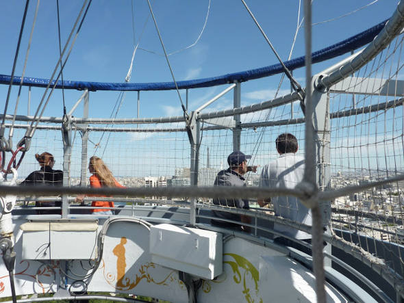 O cesto do balão não é daqueles tradicionais que sempre vemos nas fotos. Ele tem um buraco no meio e é todo protegido por uma rede, então não ha perigo algum para bebês ou crianças. Inclusive não há limite de idade para o passeio, qualquer um pode ir. A capacidade máxima é para 30 pessoas, e de acordo com eles, é o balão com maior capacidade de pessoas do mundo! O cesto tem área de circulação, que permite que os visitantes circulem, vendo as diversas vistas da cidade, incluindo uma muito boa do rio Sena.