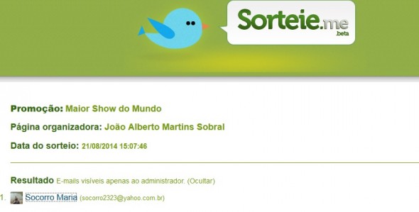A internauta Socorro Maria foi a vencedora da promoção de um par de convites para O Maior Show do Mundo. A nossa equipe entrará em contato com ela. Obrigada a todos pelas participações.