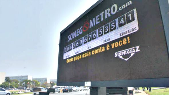 Na manhã desta quarta-feira, em Brasília, será instalado, na Esplanada dos Ministérios (ao lado do Museu Nacional da República), a partir das 8h, o painel do Sonegômetro — que contabiliza em tempo real o valor total dos tributos sonegados no Brasil. No local também será divulgado um levantamento feito pelo Sindicato Nacional dos Procuradores da Fazenda Nacional (Sinprofaz), que revelará dados sobre o valor total dos débitos tributários inscritos dívida ativa da União; os setores da economia que mais têm débitos inscritos na DAU; os estados brasileiros que mais concentram os débitos tributários e o montante de impostos sonegados de janeiro até agosto de 2015 (Sonegômetro).