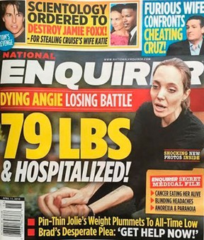 A atriz Angelina Jolie deu um susto nos seus fãs. De acordo com a revista semanal “The National Enquirer”, Angelina foi internada em “estado crítico”, diagnosticada com “câncer, anorexia e paranoia”. Além disso, ela também estaria correndo risco de morte, já que estaria pesando apenas 35 kgs.