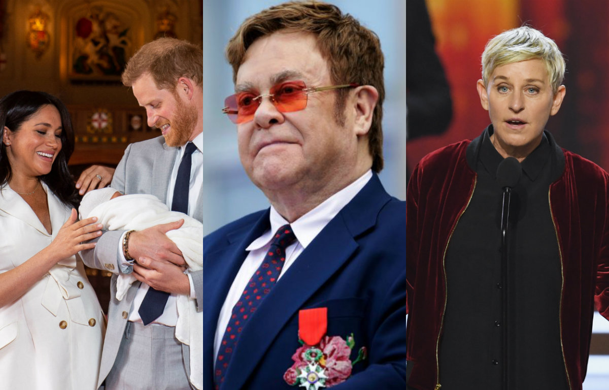 Meghan Markle e prícipe Harry com seu filho Archie, Elton John e Ellen – Créditos: Reprodução/AFP.