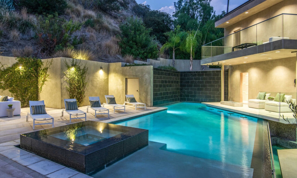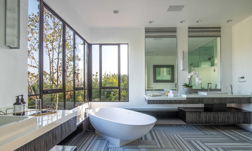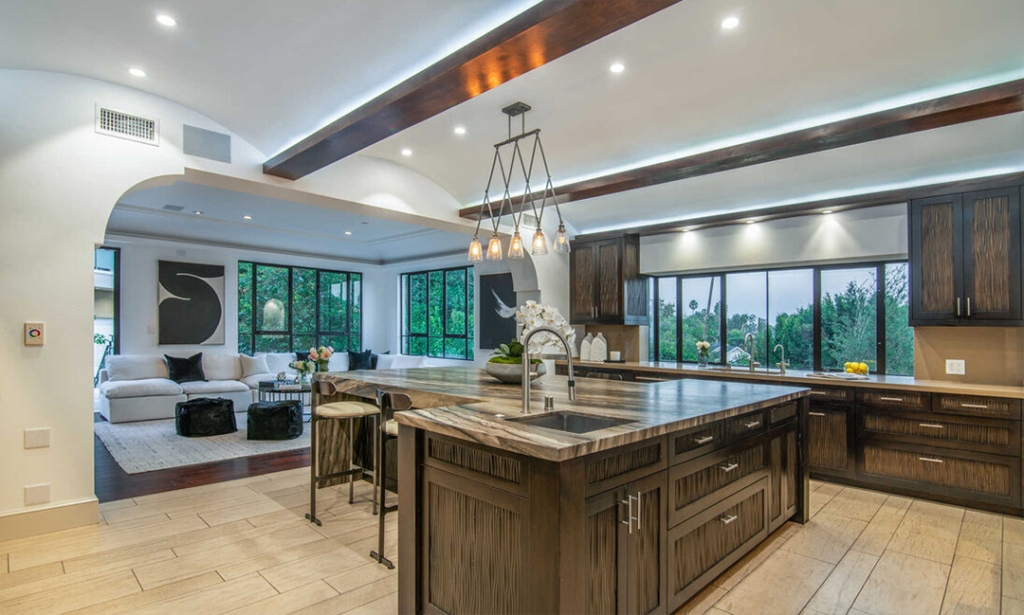 Com 6 quartos distribuídos nos 650 metros quadrados, a mansão ainda conta com oito banheiros e um espaço de hóspedes com suíte e academia acima da garagem, além de um cinema, piscina, spa e uma sala de sinuca. Veja mais fotos: