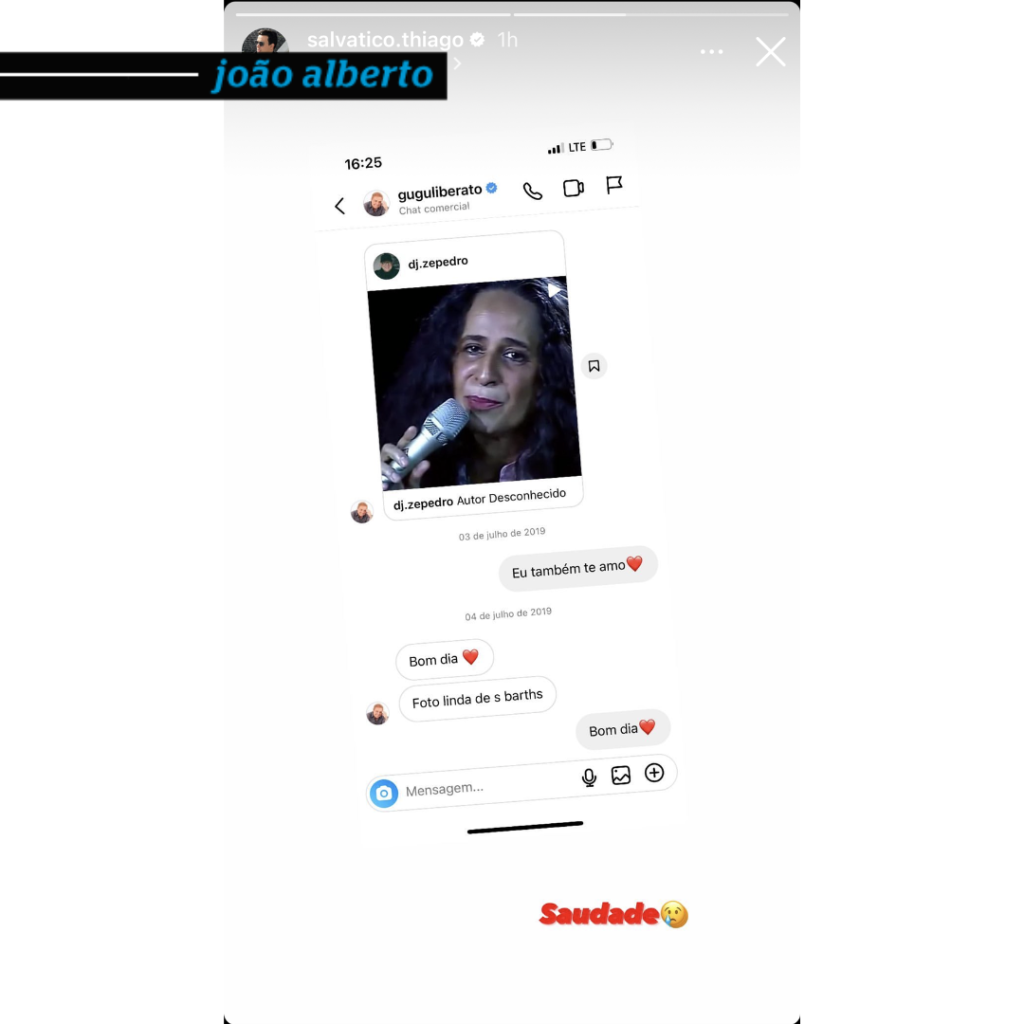 Em meio à polêmica, Thiago Salvático, suposto namorado do apresentador, publicou uma foto de uma conversa com ele e escreveu “saudades”. O print mostra Gugu enviando um vídeo de Maria Bethânia para Thiago, que responde com “Eu também te amo”.